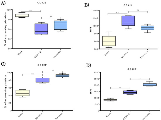 DENV-2 induced changes in CD42b molecule and activation CD62P marker on human platelets. Platelets from healthy donors (n = 10) were analyzed. Platelets were incubated with DENV2 to a MOI of 0.5 for 4 h at 37 °C. For each experiment, mock and thrombin groups were included. Percentages of platelets expressing CD42b molecule in each group are shown (A); as well as median fluorescence intensity (MFI) that indicate density of of CD42b molecule on the cell surface (B); as a measure of platelet activation, the percentage of CD62P-expressing platelets was determined (C); as well as MFI of CD62P expression (D). Unpaired t-test and Mann-Whitney U distribution were used for these experiments, where ** p < 0.01 and *** p < 0.001, ns = not significant.