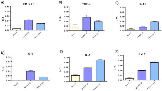 For these assays, suspensions of 3 × 108 platelets/mL from heathy donors were stimulated with DENV-2 (0.2 MOI) for 4 h at 37 °C in 5% CO2 atmosphere; mock and thrombin (0.02 U/mL) groups were included in the assay. After stimulus, platelets were centrifuged at 2000 G for 10 min at RT; supernatants were collected and kept at −70 °C until used. Supernatants from each experimental group were pooled (n = 6 for each pool) for the analysis, and two pools were examined for each experimental group, DENV-2 treated, mock, and thrombin. Cytokines and chemokines (GM-CSF, IFNγ, IL-1α, IL-1β, IL-2, IL-4, IL-6, IL-8, IL-10, IL-12, IL-17A, and TNF-α) were measured in these samples with the Human Inflammatory Cytokines Multi-Analyte ELISArray Kit MEH-004A (Qiagen Hilden, Germany). Readings for optical density were made at OD = 450 nm immediately on a Spectra Max M3 (Molecular Devices, Sunnyvale, CA, USA). The protocol was developed in accordance with the manufacturer’s recommendations. Samples were tested in duplicate, and optical densities for each tested group were graphed.