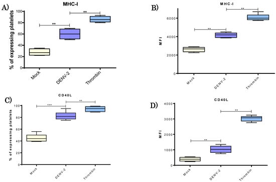 To explore the relevance of MHC class I molecules in response to DENV-2 in our system, measurement of the intensity of membrane expression was made, as well as the percentage of platelets displaying the respective molecule (Figure 4). There was a significant increase in the percentage of platelets expressing MHC class I in the DENV-2 versus mock group. A range of 23–35% was determined for the mock group and 50–75% for the DENV-2-exposed platelets (Figure 4A). Mean fluorescence intensity (MFI) revealed also a significantly greater mean density (p < 0.01) of MHC-I molecules on the surface of DENV-2 stimulated platelets (Figure 4B).