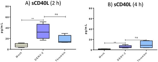 In regard to the expression of the CD40L protein in platelets, an almost two-fold increase was detected in the DENV-2 versus mock group at 4 h with a MOI of 0.2. The expression of the CD40L protein on the surface of platelets is known to modulate the inflammatory response of endothelial cells [34].