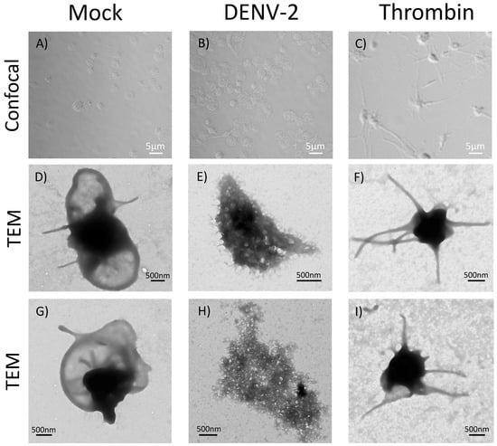 The effect of DENV-2 stimulation on the platelet morphology was evaluated with confocal microscopy and TEM. For these assays, platelets were exposed to DENV-2 to a MOI of 0.2 for 4 h and examined by confocal microscopy; significant morphological changes were observed (Figure 6B): these included swollen and elongated cells, which were not observed in mock control (Figure 6A); platelets treated with PEG/FBS or treated with an unrelated PEG-precipitated virus. The overall analysis showed these morphological changes occurred in 31 to 35% of the platelets exposed to DENV-2 treatment at the examined MOI (0.2) and time point (4 h). In addition, notorious changes occurred in the thrombin group, although morphology clearly differed from the DENV-2-treated group. To obtain better details on the morphological changes, platelets were examined by TEM at a higher MOI (0.5) of DENV-2 at the same time point (4 h). No considerable modification, due to undesirable activation in the shape of platelets was found in the mock group (Figure 6D,G), but DENV-2 induced drastic changes (Figure 6E,H), very different to those observed in the thrombin group (Figure 6F,I). Non-stimulated platelets had a nearly discoid shape, while the thrombin control exhibited a ball-shaped platelet with a compact central electrodense zone and filopodia-like long cytoplasmic prolongations. Contrarily, platelets exposed to DENV-2 displayed multiple cytoplasmic vacuoles as well as numerous membrane blebs and microvilli (Figure 6E), meanwhile, some of these platelets displayed more profound changes (Figure 6H).