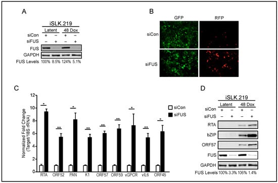 We also investigated the role of FUS in iSLK.219 cells. iSLKs are a clear-cell renal-cell carcinoma cell line (SLK) that stably maintains the KSHV.219 episome (iSLK.219) [40,47]. The recombinant KSHV.219 virus constitutively expresses green fluorescent protein (GFP) from the EF-1 alpha promoter and can be used as a proxy for the presence of KSHV within cells. The KSHV.219 virus also encodes red fluorescent protein (RFP) under the control of a viral lytic promoter. Similar to TREx-BCBL1-RTA cells, iSLK cells contain a doxycycline-inducible version of the lytic transactivator RTA. siRNA-depletion of FUS in iSLK.219 cells during latency and 48 h post-reactivation was efficient, reducing FUS levels by 91.5% and 94.9%, respectively (Figure 2A). Forty-eight hours post-reactivation, GFP and RFP positive cells were analyzed by fluorescence microscopy in FUS- and control-siRNA-treated cells. FUS depletion resulted in a marked increase in the number of RFP positive cells, suggesting more efficient entry into the lytic cycle (Figure 2B). Using RT-qPCR we quantified the expression of nine lytic genes. All viral transcripts analyzed were expressed greater than 4-fold more in FUS-depleted cells relative to control-siRNA treated cells (Figure 2C). Additionally, protein levels of RTA, bZIP, and ORF57 were increased in FUS-depleted lytic iSLK.219 cells relative to control-siRNA treated cells (Figure 2D).