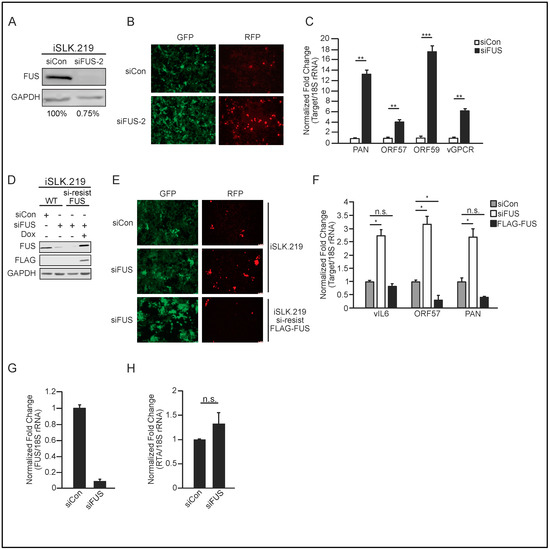 Independent verification of FUS-siRNA specificity. (A) iSLK.219 cells were depleted of FUS with a second FUS-siRNA and induced with doxycycline for 48 h. Knockdown efficiency was determined by western blot analysis and is indicated beneath each lane. (B) Fluorescent microscopy, at 10× magnification, of iSLK.219 cells depleted of FUS in (A). (C) Quantification of viral gene expression in cells described in (A) by RT-qPCR. All samples were normalized to 18S and siCon set to 1. (D) Western blot analyses of protein extracts from WT iSLK.219 and iSLK.219 cells transduced with siRNA-resistant FLAG-tagged FUS. Cells were treated with either control or FUS-siRNA and induced for 48 h with doxycycline. (E) Fluorescent microscopy, at 10× magnification, of cells in (D). (F) RT-qPCR of viral gene expression in cells described in (D). All samples were normalized to 18S and siCon set to 1. (G) Uninfected iSLK control cells, which harbor the doxycycline-inducible RTA, were depleted of FUS with siRNA for 48 h, followed by doxycycline treatment for 24 h. FUS knockdown was determined by RT-qPCR. (H) Quantification of RTA mRNA levels from cells in (G). Student t test used to determine statistical significance * p ≤ 0.05. ** p ≤ 0.005. *** p ≤ 0.0005, n.s. not significant.