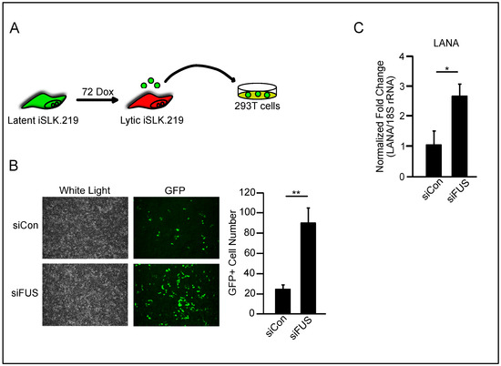 Having confirmed the specificity of the FUS-siRNA and the effect of its depletion on lytic gene expression, we next leveraged the fact that the KSHV.219 virus constitutively expresses GFP and quantified infectious virion production using a supernatant transfer assay. Following FUS- or control-siRNA treatment, iSLK.219 cells were reactivated for 72 h, whereupon supernatants were collected and used to infect HEK293T cells (Figure 4A). Infection of HEK293T cells using supernatants from iSLK.219 cells treated with FUS-specific siRNA resulted in a 4-fold increase in GFP-positive cells compared to supernatants from control-siRNA treated cells (Figure 4B). Additionally, we quantified the expression of the latent viral transcript LANA by RT-qPCR. Consistent with the number of GFP-positive cells, significantly more LANA was expressed in HEK293T cells infected with virions from FUS-siRNA treated iSLK.219 cells compared to control-siRNA treated cells (Figure 4C). Collectively, these results establish that FUS restricts KSHV reactivation and production of infectious virions in both PEL and iSLK.219 cells. This is the first demonstration of an antiviral role for FUS.