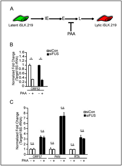We next sought to determine at which stage of lytic reactivation FUS affects KSHV gene expression. Herpesvirus gene expression occurs in a transcriptional cascade, wherein immediate-early genes are first transcribed, followed by early gene expression and viral DNA replication, and then late gene expression (Figure 5A). To determine where in the transcriptional cascade FUS affects viral gene expression, FUS- and control-siRNA treated iSLK.219 cells were treated with the viral DNA polymerase inhibitor phosphonoacetic acid (PAA), and viral early and late gene expression was quantified following reactivation. PAA treatment resulted in a significant decrease in the expression of the KSHV late gene ORF52, consistent with the dependency of late gene expression on viral replication (Figure 5A,B). Viral gene expression was significantly increased in FUS-siRNA treated cells compared to control-siRNA treated cells, and PAA treatment did not reduce the effect of FUS-siRNA (Figure 5C). These results indicate FUS restricts KSHV reactivation early during reactivation, prior to viral DNA replication and independent of late gene expression.