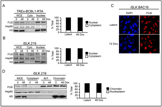 The early effect of FUS on KSHV reactivation led us to hypothesize that FUS regulates the early transcriptional dynamics on the KSHV genome. However, FUS is a nucleocytoplasmic shuttling protein and can reside in either the cytoplasm or nucleus depending on the cellular state, and stress has been shown to promote its cytoplasmic relocalization [39,48]. Thus, we monitored FUS localization in TREx-BCBL1-RTA cells during latency and lytic reactivation by subcellular fractionation. Western blot analyses demonstrated that FUS predominantly localized to the nucleus in both latency and 48 h post-lytic reactivation (Figure 6A).