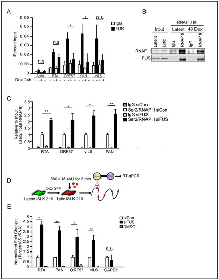 FUS regulates RTA nascent RNA expression. (A) FUS occupancy of the indicated viral genes was analyzed by Chromatin immunoprecipitation (ChIP) in iSLK.219 cells 24 h post-reactivation. IgG was used as a negative control. (B) Western blot of RNAP II immunoprecipitation (IP) from iSLK.219 cells at latency and 48 h post-reactivation. (C) Ser2 RNAP II occupancy was determined at the indicated viral genes by ChIP 48 h post-reactivation in iSLK.219 cells treated with either siCon or siFUS. Ser2 levels were normalized to total RNAP II present at each genomic loci as determined by ChIP. siCon ratio set at 1. (D) Schematic representation of the assay employed to measure nascent RNA synthesis. Cells are labeled with 500 mM 4sU for 3 min prior to total RNA isolation. Labeled RNA is subjected to thiol-specific biotinylation, followed by streptavidin purification and RT-qPCR. (E) RT-qPCR of nascent viral and host transcripts. Values were normalized to 18S. DMSO was added in place of 4sU as a negative control. Student t test used to determine statistical significance * p ≤ 0.05. ** p ≤ 0.005, n.s. not significant.