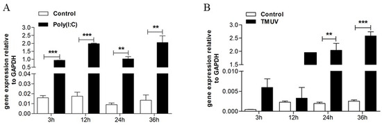 Time course study of goose myxovirus resistance protein (goMx) messenger RNA (mRNA) expression upon polyinosinic polycytidylic acid (Poly(I:C)) stimulation and Tembusu virus (TMUV) infection. Goose embryo fibroblast (GEF) cells were either induced with Poly(I:C) (30 mg/mL; 50 μL/well) or TMUV (1000 50% tissue culture infection dose (TCID50); 100 μL/well), and total RNA was harvested at designated time points and reverse transcribed into complementary DNA (cDNA). The resultant cDNA was used as the template in a quantitative PCR reaction, using primers specific for goMx, and glyceraldehyde 3-phosphate dehydrogenase (GAPDH) was used as an internal reference. (A) The mRNA expression levels of goMx against Poly(I:C) stimulation in GEF. (B) Analyses of goMx transcript levels post-TMUV infection in GEF. Each time point was assayed in triplicate, with error bars given as mean ± SD. Error bars indicate standard error. Asterisks (*) mark the significant difference between experimental and control groups (** p < 0.01; *** p < 0.001).