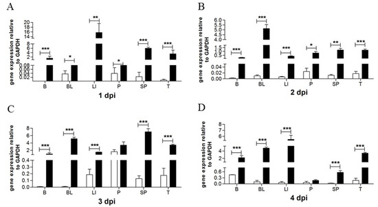 Tissue-specific mRNA of goMx in TMUV-infected goslings. The white columns are for control groups, while the black columns stand for test groups. Goslings were infected with TMUV (1 μL volume of TMUV per gram of the body weight), then tissues were collected, including brains (B), blood (BL), liver (LI), pancreas (P), spleen (SP), and thymus (T). GoMx transcript detection at one day (A), two days post infection (B), three days (C) and four days (D) post infection. GAPDH was employed as an internal reference. Asterisks (*) mark the significant difference between experimental and control groups (* p < 0.05; ** p < 0.01; *** p < 0.001). Error bars indicate standard error.