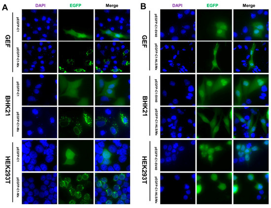 Cellular localization of the goMx protein. (A) Subcellular localization of pEGFP-C1-Mx in GEF, baby hamster kidney (BHK21), and human fetal kidney (HEK) 293T cells. Cells were transfected with indicated plasmids (pEGFP-C1-Mx or pEGFP-C1). At 24 h post-transfection (hpt), cells were fixed and stained with 4′,6-diamidine-2′-phenylindole dihydrochloride (DAPI). (B) The putative bipartite nuclear localization signal (NLS) is attributed to the nucleus localization of the fusion goMx protein. Localizations of pEGFP-C1-NLS/Mx in GEF, BHK21, and HEK 293T cells are shown, while pEGFP-C1-SV40 works as the positive control. The overexpressing protein appeared green, and the nucleus was stained blue with DAPI. Fluorescence was observed by fluorescence microscopy under a magnification of 400 times and analysed using Image Pro Plus 6.0.