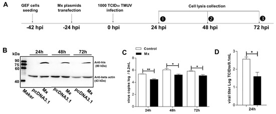 The antiviral activity of goMx. (A) Experimental procedure of the antiviral test. (B) Detection of goMx protein by western blot analysis. Cell extracts were prepared, and samples of 15 μL of protein per lane were separated by SDS-polyacrylamide gel electrophoresis. GoMx protein was detected with a His-tagged monoclonal antibody. (C) Inhibition of TMUV genomic RNA by goMx in GEF. At 24, 48, and 72 h post-infection (hpi), infected GEF were collected and lysed in 500 μL cell culture supernatants. Total RNA was extracted using 200 μL cell lysis and RT-qPCR was performed in triplicate. Data are shown as mean ± SD of three independent experiments (** p < 0.01, * p < 0.5). (D) TCID50 test. The infectious titers from culture supernatants were titrated using the TCID50 test from control GEF and goMx-expressing cells. The results showed the differences between both groups were significant at 24 hpi. Data are expressed as the mean ± SD of three independent experiments.