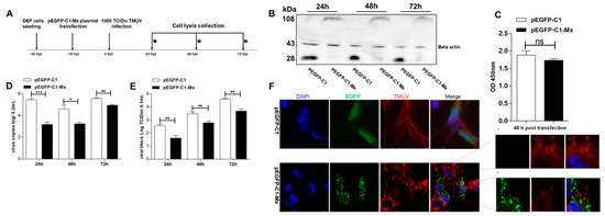 GEFs in 12-well plates were transiently transfected with wild-type goMx or its variants at 1.6 μg per well, followed by infection with 100 μL of 1000 TCID50 TMUV at 24 h post-transfection (hpt; 18 hpt for pEGFP-C1-Mx and pEGFP-C1groups), and then, the cell lysates were resuspended using 500 μL of PBS at 24 h, 48 h, and 72 h after infection (hpi). The collected suspension was used for determining TMUV TCID50 and copies. Total RNA was purified using a TIANamp Virus DNA/RNA Kit (Tiangen, Beijing, China), and was instantly used for reverse transcription. The viral copies of TMUV-infected GEFs were quantified with RT-qPCR using the standard curve, Y = 39.995 − 3.529logX. For each time point, three independent assays were performed, and each sample was analyzed in triplicate. Additionally, the TCID50 assay was performed in a 96-well plate with monolayer GEF cells infected with 0.1 mL of ten-fold serial dilutions of the viral samples. After 96 h of incubation at 37 °C, the titers of the virus were calculated using the standard method of Reed and Muench.