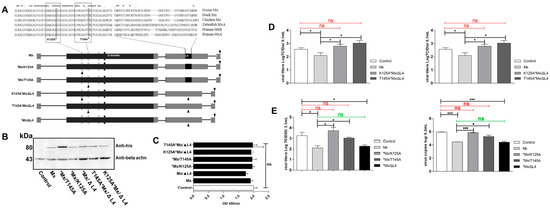 The antiviral determinants of goMx. (A) Construction of wild-type goMx and its variants, including the GTPase-deficient mutants, *Mx/K125A and *Mx/T145A, the *Mx/ΔL4 deletion plasmid, and two combination mutation plasmids of K125A*Mx/ΔL4 and T145A*Mx/ΔL4. The solid pillar stands for the Mg2+ active domain, while the blank pillar represents the tripartite GTP-binding domain consisting of GxxxxGKS, DxxG, and TKxD. The black triangles mark the point and deletion mutations, while the inverted black triangles represent the His-tag. (B) Detection of His-tagged wild-type goMx and its variants using western blot analysis. GoMx proteins and beta-actin were analyzed with western blot using an anti-His monoclonal antibody and anti-beta-actin antibody, respectively. The polyvinylidene fluoride (PVDF) membrane incubated with the goat-anti-mouse secondary antibodies. (C) Cell viability analysis of goMx and its variant protein in GEF. CCK8 assays of indicated plasmids were performed in triplicate. (D) The antiviral activity of goMx and its variants, K125A*Mx/ΔL4 and T145A*Mx/ΔL4, completely abolished antiviral activity. Transiently transfected GEF-expressing His-tagged Mx or its variant proteins, K125A*Mx/ΔL4 and T145A*Mx/ΔL4, were infected with 100 μL of 1000 TCID50 TMUV per cell, then the cells were collected by three-cycle freezing and thawing, using a volume of 500 μL PBS at different time points (24, 48, and 72 hpi). The inhibition ability of TMUV was determined by TCID50 and viral copy tests. Results are presented as means of technical duplicates of three independent experiments. (E) The antiviral activity of Mx and its variants. The K125 and T145 amino acids in the GTPase domain could account for deficient antiviral activity. Antiviral activity of the single substitution of *Mx/T145A and *K/125A or deletion *Mx/ΔL4 was assessed by TCID50 and viral copy tests. The statistical analysis was performed in GraphPad Prism using unpaired two-tailed t-tests: “ns” means no significance (the red “ns” is compared to the control, and the green “ns” is compared to the wild-type Mx as the experimental positive group; * p < 0.05; *** p < 0.001.).