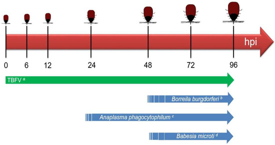Hard ticks often wait many months between blood meals; therefore, the pathogens that infect hard ticks have adapted to survive these extended periods. The causative agents of Rocky Mountain spotted fever (Rickettsia rickettsii), Lyme disease (Borrelia burgdorferi), human babesiosis (Babesia microti), and human granulocytic ehrlichiosis (Anaplasma phagocytophilum) have all been shown to undergo reactivation from their dormant and essentially noninfectious state upon the next episode of tick feeding [17,18,19,20]. Transmission of B. burgdorferi by a single infected nymph was observed after 48 h of tick attachment, with increased transmission occurring between 72 to 96 h [21,22,23], a phenomenon that is largely attributed to the extensive reactivation phase of these spirochetes (Figure 2).
