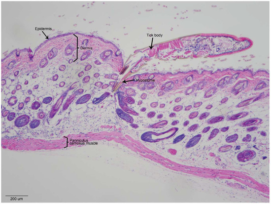 The mouthparts of Ixodes species ticks, which vector the flaviviruses TBEV and POWV, are relatively long compared to other tick species (e.g., Dermacentor species and Haemaphysalis species). When TBFV-infected Ixodes species adults or nymphs feed on mice, the tick hypostome penetrates to the subdermal fat cells, sometimes reaching the skeletal muscle layer [25,27]. Figure 3 shows a cross-section of an I. scapularis nymph feeding on a naïve mouse for 3 h. The immature tick hypostome penetrates through the epidermis and dermis, with the tip of the hypostome ending amidst the subdermal fat cells (Figure 3). As a hard tick initiates feeding, its cheliceral teeth first pierce the skin and subsequently retract in a breaststroke-like motion, causing the serrated hypostome to penetrate the skin [31]. As a result of these actions, the epidermal and subdermal architecture can appear as if it is streaming toward the tick feeding site (Figure 3) [32]. Within 1 to 3 h of Ixodes tick attachment, inflammatory cells are recruited near the tick mouthparts, with some cell infiltrates extending into the underlying muscle (Figure 3) [25,32]. As an attached tick initiates feeding, all of these epidermal, dermal, and subdermal components, including inflammatory cell infiltrates, are in immediate contact with tick salivary molecules and flavivirus that is deposited at the tick feeding site. Because the cutaneous interface is such a complex and dynamic region during tick feeding, it is important that in vivo models (infected ticks fed on mammals) are used in experiments that seek to examine the early host immune response to flavivirus-infected tick feeding.