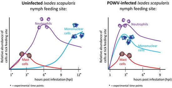 Host cutaneous immune response to tick-borne flavivirus (Powassan virus (POWV))-infected versus uninfected Ixodes scapularis nymph feeding. Combined results from histopathological analyses and comparative gene expression analyses demonstrate that neutrophil and mononuclear cell infiltrates are recruited earlier to the feeding site of a POWV-infected I. scapularis nymph versus an uninfected I. scapularis nymph [27,32,33]. The graphs illustrate the relative abundance of certain categories of immune cells at the tick feeding site. Asterisk represents experimental time points from these studies.