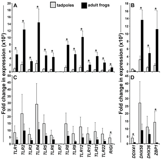 We previously showed that X. laevis tadpoles and adult frogs undergo distinct type I and type III IFN responses at their skin following water exposure to FV3 [19]. Typically, the IFN responses are mounted following the recognition of viral (and other types of pathogen) infections by pathogen pattern recognition receptors (PRRs) [5,22,23,24]. To examine the capacities of tadpole and adult frog skin cells to recognize viral (as well as other) infections, we isolated the respective cells and examined their gene expression of a panel of PRR genes, including those responsible for the recognition of viral as well other types of pathogens (Figure 1). With the exception of the TLR7, adult X. laevis possessed a significantly greater gene expression of mammalian-like (TLR1–9) and frog-specific (TLR12, 13, 21, 22) TLRs as well as the retinoic acid-inducible gene I (RIGI, Figure 1A). Moreover and compared to tadpoles, the adult frogs exhibited significantly greater skin mRNA levels of three (DHX58, DHX36, ZBP1) of the four examined cytosolic DNA sensor genes (Figure 1B).