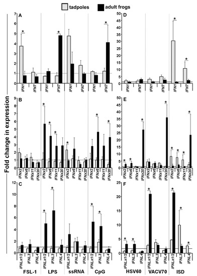 The PAMP-stimulated tadpoles and adult frog skin cells exhibited the upregulation of distinct IFN genes (Figure 2). For example, the tadpole, but not the adult skin cells stimulated with the FSL-1 lipoprotein upregulated their IFN1 gene expression (Figure 2A). Conversely, the adult frog skin cells were much more responsive to LPS than the tadpole skin cells, as the former upregulated the IFN7, IFNx2, IFNx6, IFNx11, IFNx20, IFNLx1/2, and IFNL3 in response to this stimulus (Figure 2A–C). The tadpole skin cells stimulated with ssRNA exhibit greater expression increases of IFN1 and IFNx2 genes than adult frog skin cells (Figure 2A,B). The adult frog skin cells showed greater transcriptional increases in the IFN7, IFNx6 IFNx20, IFNLx1/2, and IFNL3 gene expression (Figure 2A–C).