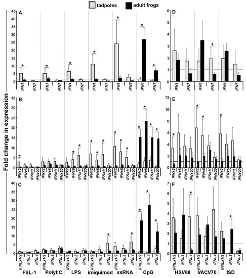 Here, we expand on our previous work by examining the roles of a panel of intronless and intron containing type I and type III IFNs in the X. laevis tadpole and adult frog responses to FV3 challenge, as well as to a range of pathogen pattern recognition receptor agonists such as lipoprotein, lipopolysaccharide, polyinosinic:polycytidylic acid, CpG DNA, imiquimod, single stranded RNA and several viral DNAs.