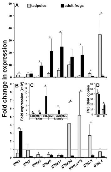 The above studies utilized isolated animal cells and therefore recapitulated the IFN responses by those tadpole and adult skin and kidney cells that would be present within the respective tissues at a steady state. However, the above expression studies cannot account for the potential additional IFN-expressing cell population that may be recruited into these respective tadpole and adult tissues upon the FV3 challenge. To reconcile this possibility, we infected tadpoles and adult frogs with FV3 by water bath and 6 h later examined the gene expression of type I and type III IFNs in their skin and kidney tissues (Figure 5A,B).