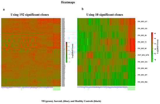 Heatmaps generated based on 192 clones and the 10 highly significant clones from the data of 176 study subjects (45 healthy controls, 24 with TB, and 107 with sarcoidosis) (a,b). Each row represents a clone, while each column represents a study subject. As shown in Figure 2, most of TB samples clustered to the right side of heatmap plots, while sarcoidosis samples and healthy controls clustered on the left side of the plot, indicating different expression profiles.