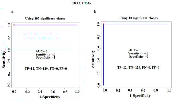 Classifiers to predict TB from healthy controls and sarcoidosis patients. (a) Performance of 192 clones on test set. (b) Performance of the top 10 classifier clones on test set. The ROC curves demonstrate excellent classification performance with AUC of 1 with sensitivity of 1 and specificity of 1.