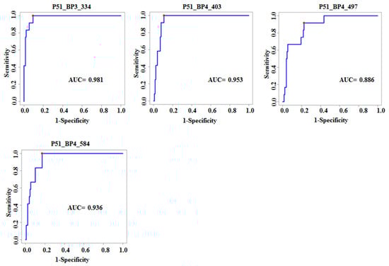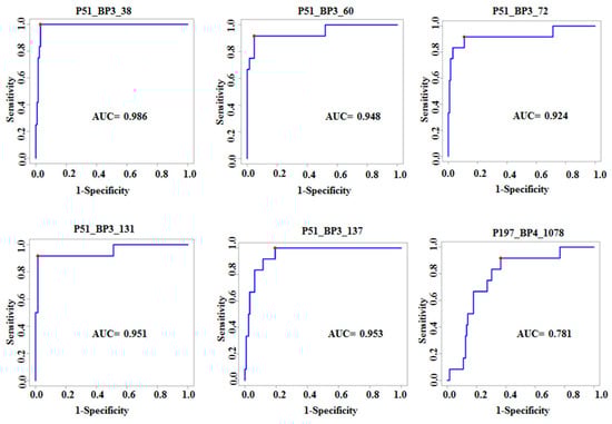 Based on the results of training and test sets, we characterized the top 10 highly performing active TB clones through sequencing. After obtaining the sequences of clones, the Expasy program was used to translate the cDNA sequences to peptide/protein sequences [18,19]. Protein blast using algorithms of the BLAST program were applied to identify the highest homology to identified peptides [18,19]. The identified clones were blasted with human and MTB genomes and then selected those specific peptide sequences with the highest homology of amino acids sequence. All top 10 clones have the highest homology with TB sequences. Additionally, we compared these results with corresponding nucleotide sequences using nucleotide BLAST and determined the predicted amino acids in frame with T7 phage 10B gene capsid proteins. All of the 10 classifier clones are coded by the inserted gene fragments leading to out-of-frame peptides, therefore meeting the criteria of mimotopes [26] (Table 2). As sera of active TB patients reacted with these out-of-frame peptides, it is likely that these TB clones are produced as a result of altered reading frames or alternative splicing, as described in previous studies [18,19,26]. Full length of peptides and genes of the ten classifiers clones are shown in Table S1. Table 2 shows the 10 most significant TB antigens, gene names, sensitivity, specificity, and FDR adjusted p-values. Figure 4 shows the ROC curves for six clones that are increased in TB, while Figure 5 shows ROC curves for four clones decreased in TB.