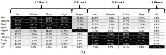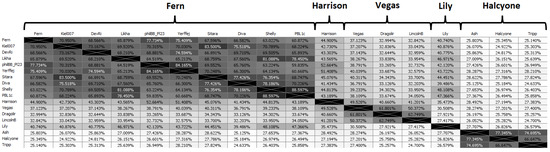 Phages were placed into a cluster if they had greater than 60% ANI with at least one other phage in that cluster [50]. Phages were placed into a subcluster if they had greater than 90% ANI with at least one other phage in that subcluster. Because of the large number of phages, the full ANI distance matrix is large (48 × 48), and we have thus selected a “representative” phage from each subcluster to demonstrate the ANI matrix. The “representative” phage for each subcluster is chosen as the phage with the highest average ANI to all other phages in its subcluster. Singletons (phages that do not belong to a cluster or subcluster) are treated as representatives of their own subcluster. The ANI distance matrix for representative phages is shown in Figure 3, while the full ANI distance matrix is included as Supplementary Figure S1.