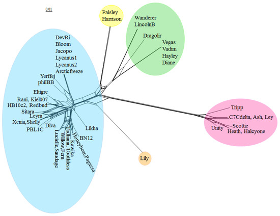 - Huson, D.H.; Bryant, D. Application of phylogenetic networks in evolutionary studies. Mol. Biol. Evol. 2006, 23, 254–267. [Google Scholar] [CrossRef] [PubMed]