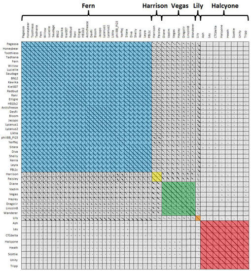 A third way of grouping phages is using dot plots, with phages having >50% contiguous dot plot identity with at least one other phage grouped into the same cluster [50]. A dot plot of all 48 P. larvae phage genomes is shown in Figure 5. Clusters are highlighted by color, with blue for the Fern cluster, yellow for the Harrison cluster, green for the Vegas cluster, orange for Lily, and red for the Halcyone cluster.