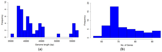 The distribution of genome length is shown in Figure 7a, and is clearly bimodal. The distribution of the number of genes in P. larvae phage genomes is shown in Figure 7b. The number of genes ranges from 58 (HB10c2) to 91 (Scottie), with a median of 72 genes per genome.