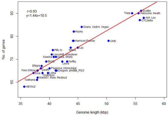 Number of genes in P. larvae phage genomes as a function of genome length. The number of genes y scales linearly with the genome length in thousands, x.