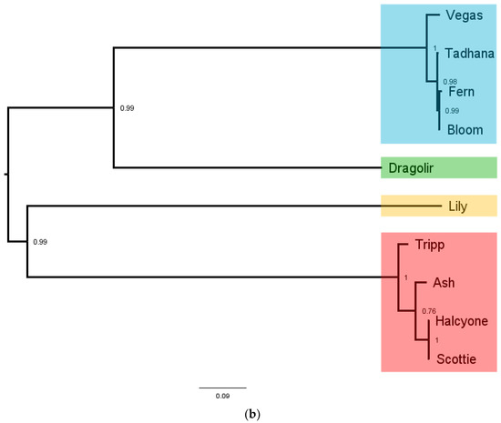 Large terminase phams are highlighted in different colors in the phylogenetic tree (Figure 10b), with LT pham 1 in blue, LT pham 2 in green, LT pham 3 in ref, and LT pham 4 in yellow. The high similarity of the large terminases of the 3′ cohesive ends phage (with the exception of the Dragolir subcluster) is reflected by the short branch lengths in that section of the tree (blue). Similarly, the high similarity of the DTR phage large terminases is reflected in the very short lengths in their region of the tree (red), while the highly divergent large terminase of Lily has the longest branch length.