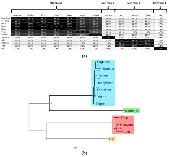 AAI distance matrix of the 10 distinct P. larvae phage major capsid proteins (a) and corresponding phylogenetic tree (b). Major capsid proteins are distributed into four phams, with each pham in the phylogenetic tree highlighted in a different color. MCP pham 1 (Fern and Harrison clusters, Diane, Hayley, Vadim, Vegas) is highlighted in blue, MCP pham 2 (Dragolir, LincolnB, Wanderer) in green, MCP pham 3 (Halcyone cluster) in red, and MCP pham 4 (Lily) in orange.