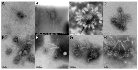 Electron micrographs of phages from the Fern cluster: (A) Eltigre; (B) Bloom; (C) Toothless; (D) BN12; (E) PBL1c; (F) Pagassa from the Vegas cluster: (G) Wanderer; and from the Halcyone cluster: (H) Ash.
