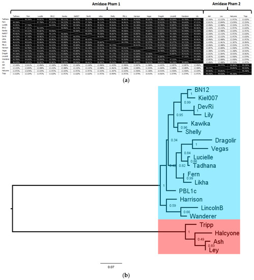 AAI distance matrix (a) and phylogenetic tree (b) of the 20 distinct P. larvae phage N-acetylmuramoyl-l-alanine amidases. These are distributed into two phams, one that contains the amidases of all cohesive ends phages (blue), and one that contains the amidases of the Direct Terminal Repeats (DTR) phages (red).