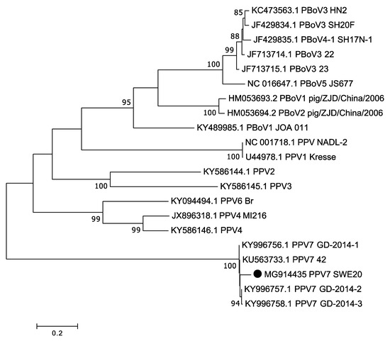Phylogenetic analysis of porcine parvovirus 7. The evolutionary history was inferred by using the Maximum Likelihood method based on the Tamura Nei model with a bootstrap value of 1000. The analysis is based on the complete nucleotide sequence NS1 gene, and, in total, there were 1483 nt positions in the final dataset. The PPV7 obtained from this study is marked with a black circle, and only bootstrap values greater than 70% are shown.