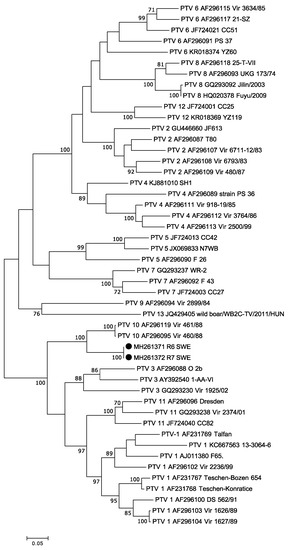 The majority of the pigs were positive for one or several members of the Picornavirales order; these members included pasivirus A, posavirus 1, and porcine sapelovirus A, as well as porcine teschovirus (PTV). Due to the high amount of teschoviral reads in some of the samples, porcine teschovirus was selected for further genetic analysis. From the two SPF pigs, very few PTV reads were recovered; yet, from two of the conventionally reared pigs (R6 and R7), the complete genome (accession number MH261371-2), including the 5’ and 3’ UTR, was obtained when all the trimmed reads were mapped back to one of the most similar teschoviruses available at GenBank. The coverage/sequence depth for R6 was 6–535 and 2–296 for R7. For both the R6 and R7 teschoviral genomes, one open reading frame (6615 nt) coding for the large polyprotein (2205 amino acids) was identified. Sequence analysis showed that the two Swedish teschovirus genomes had, on the nucleotide level, a 99.9% sequence identity. Comparing them to previously described teschoviruses from other parts of the world, the sequence identity varied between 80.0 and 87.1%. The highest similarity was seen between two teschoviruses belonging to serotype 10; in the phylogenetic analysis, the two Swedish teschoviruses grouped together in the same clade as these teschoviruses (Figure 2).