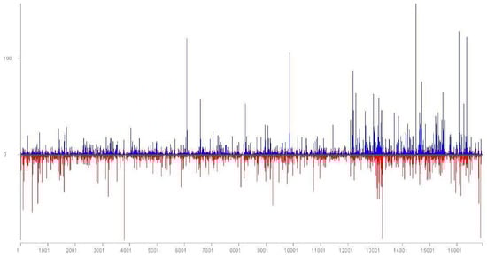 Location and frequency of Little cherry virus 1 (LChV1) small RNA reads on the LChV1 genomic RNA. Positive-sense reads are shown as blue bars; negative-sense reads are shown as red bars below the x-axis.