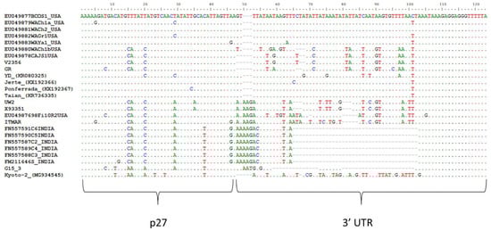 Multiple sequence alignment representing the beginning of the 3′ Untranslated Region (UTR). All available in GenBank LChV1 isolates with deposited sequences from this genomic region, were used.