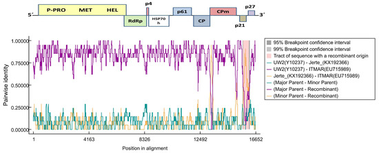 A recombination analysis performed with RDP4 on an alignment of all available full-length LChV1 genomic sequences revealed the presence of two recombination events in the 3′ part of the ITMAR genome and UW2 and Jerte are presumed to be the parental isolates (Figure 3). These events were detected by six out of the seven algorithms used (RDP, GENECONV, BootScan, MaxChi, Chimaera, 3Seq) [26,27,28,29,30]. No clear evidence of recombination was observed for the LChV1 sequences reported in the present study.