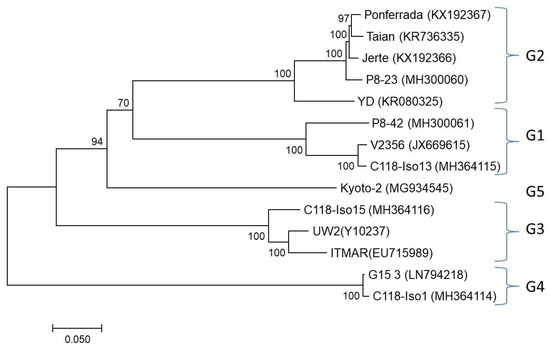 A mixed infection with different LChV1 genotypes was identified in samples C118 and P8 from Greece and Spain, respectively. The C118-Iso1 sequence shares 99% identity with the G15 3 described in the present study. The C118-Iso13 sequence shares 98% identity with the V2356 isolate while the C118-Iso15 sequence shares 94% and 92% identity, respectively, with isolates UW2 and ITMAR (Table S2). The P8-23 sequence shares 97% identity with the Ponferrada, Jerte and Taian isolates. The P8-42 shares 90% identity with the V2356 isolate (Table S2). The co-infection of the sweet cherry trees with different LChV1 isolates was confirmed by RT-PCR amplification and RFLP analysis of the amplified CP gene (Supplementary Materials).