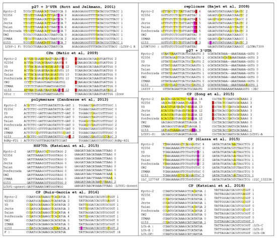 The high genetic diversity of LChV-1 and the highly divergent isolates reported here could affect the reliable detection of viral isolates. Indeed, an in silico analysis of the detection primer pairs reported in nine different publications revealed in most cases a significant number of mismatches with at least some LChV1 isolates, to the extent that the amplification of these isolates is likely compromised, limiting the polyvalence of the detection assays employing them (Figure 5). This analysis also showed that the primers used in two detection schemes targeting the HSP70h or the CP [8,25], likely exhibit the highest detection range.