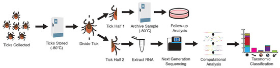 Tick analysis workflow. Adult Ixodes scapularis ticks were collected from northwest Wisconsin. Ticks were then stored at −80 °C in mosquito diluent. Individual ticks were divided in half. The first half was subjected to next-generation sequencing, computational analysis, and taxonomic classification. The second half was archived at −80 °C for future analysis.