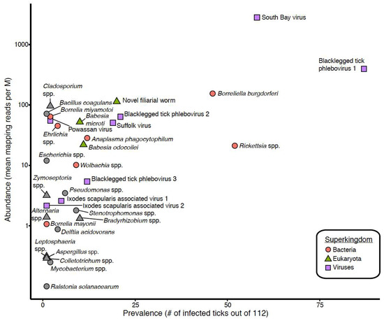 South Bay virus and Blacklegged tick phlebovirus are the most abundant and prevalent microorganisms in the sampled I. scapularis. The prevalence (number of infected ticks out of 112) and average RNA level (average mapping reads per million unique reads on a log scale) for the indicated taxa are plotted. The superkingdom of each taxa is indicated by shape and color as indicated. The 18 taxa that were selected for focused analysis are colored (other taxa in grey).
