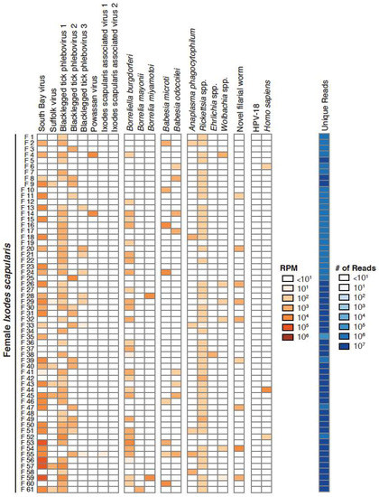 Abundance of predominant microbial constituents of female adult Ixodes scapularis. 18 taxa of interest were selected for abundance analysis. Between 1 and 9 taxa were detected in female adult ticks (n = 61). The number of mapping reads per million unique reads (RPM) is shown, as is the number of unique reads in each dataset. RPM values >10 are shown. HPV-18: human papillomavirus type 18.
