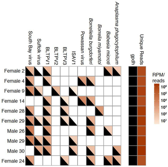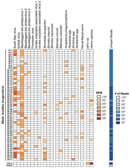 In October 2015, 112 adult Ixodes scapularis (61 female; 51 male) were collected in northwest Wisconsin. Ticks were cut in half. One half was stored in mosquito diluent at −80 °C, and RNA was extracted from the other half (Figure 1). RNA-derived shotgun libraries were sequenced using paired-end 2 × 150 sequencing on an Illumina NextSeq instrument, generating an average of 2.1 × 106 read pairs per dataset. After removing low-quality, adapter and tick-derived reads, an average of 4.8 × 104 read pairs per dataset remained (2.7%). Remaining reads were assembled and taxonomically assigned by comparison at nucleotide and protein levels to NCBI database sequences. In most cases, contigs shared a high degree of sequence identity with existing sequences (Table 1). In other cases, contigs were less closely related to database sequences. For instance, we identified contigs that shared between 76.1% and 98.2% nt identity in BLASTN alignments with various nematode sequences (Table 1). Because these sequences appeared to derive from a previously uncharacterized worm, confident species or genus-level assignment was not possible, and contigs were assigned at the level of the family Onchocercidae (nematodes). Similarly, unambiguous species-level assignment was not possible for contigs mapping to certain bacterial taxa (Rickettsia, Ehrlichia and Wolbachia) so contigs mapping to these taxa were assigned at the genus level. We calculated the number of reads mapping to particular taxa per million unique reads (RPM) as a measure of RNA level and taxon abundance. Because we did not clean ticks prior to RNA extraction, it is possible that some sequences derived from microbes present on the surface of ticks. Also, detection of pathogen sequences does not necessarily indicate that that particular tick would be a competent vector for the pathogen. Total HeLa cell RNA and water were processed and analyzed in parallel as positive and negative controls.