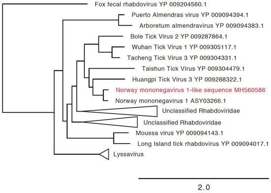 Phylogenetic characterization of new mononegavirus sequence. Phylogeny based on an alignment of a 508 amino acid region of the viral RNA dependent RNA polymerase (RdRp). This alignment includes mononegavirus reference sequences available through NCBI. Additional closely related unclassified viruses were also included. Triangles indicate collapsed clades. The novel virus sequence is shown in red. Heartland virus was used as an outgroup to root the tree.