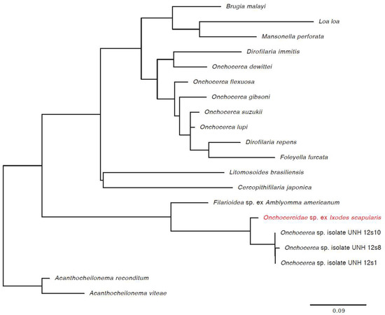 Phylogenetic characterization of novel filarial worm. Phylogeny based on an alignment of a 174 base pair region of the 12S rDNA sequence. This alignment included other filarial worm 12S rDNA sequences as used in Namrata, et al. [56]. The novel filarial worm (Onchocercidae sp. ex. Ixodes scapularis) is shown in red.