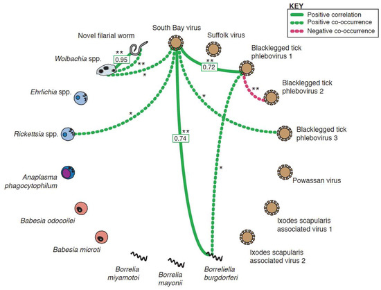 Five positive and one negative co-occurrence relationships were identified after correcting for multiple hypothesis testing (Figure 9). The positive relationships were: Wolbachia spp. and the novel filarial worm (p-value < 1 × 10−6), Wolbachia spp. and SoBV (p-value = 0.021), Rickettsia spp. and SoBV (p-value = 0.041), SoBV and BLTPV3 (p-value = 0.02), and Blacklegged tick phlebovirus 1 (BLTPV1) and B. burgdorferi (p-value = 0.039). The sole negative co-occurrence was between BLTPV1 and BLTPV2 (p-value < 1.0 × 10−6) (Figure 3 and Figure 4).
